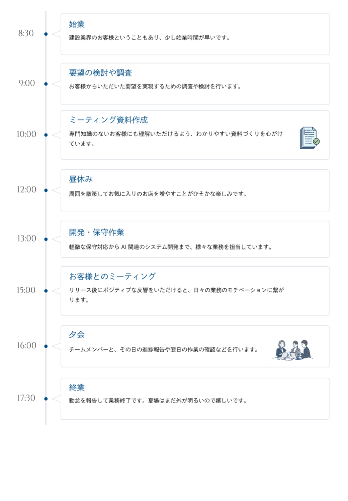 現在は、大手建設会社向けナレッジマネジメントシステムの新規開発プロジェクトを担当しています。要件定義から仕様決定、開発、リリース、保守まで一貫して対応し、PMとしてチームをまとめています。お客様との打ち合わせは週2回ほど。限られた準備期間で資料作成や提案を行うため、スピード感と柔軟性が求められます。